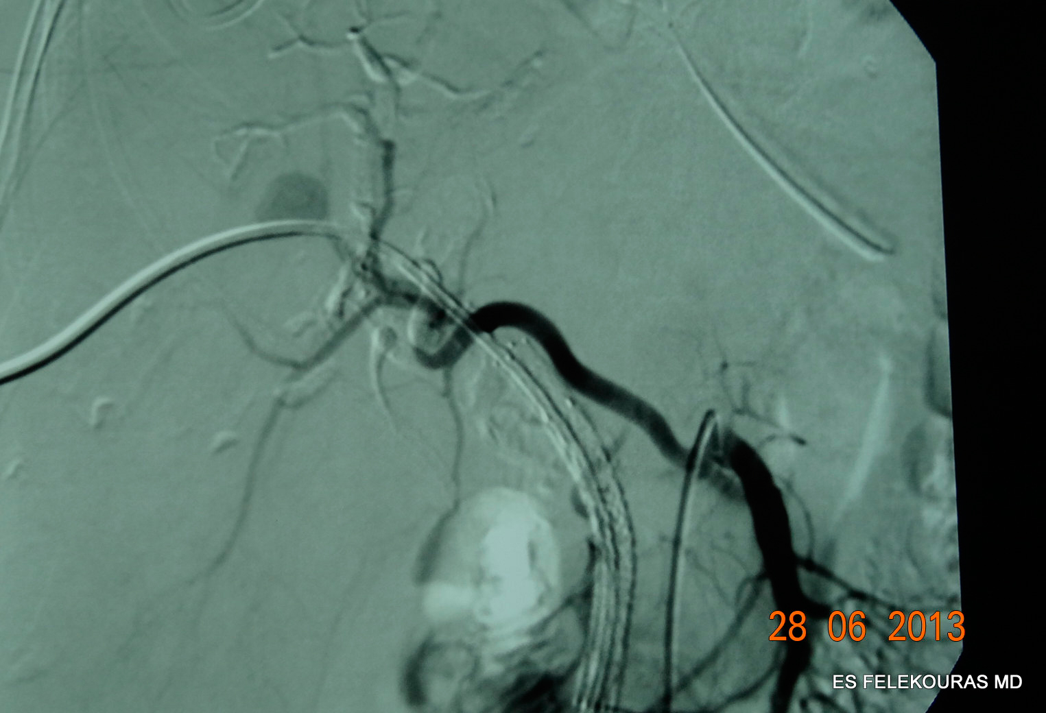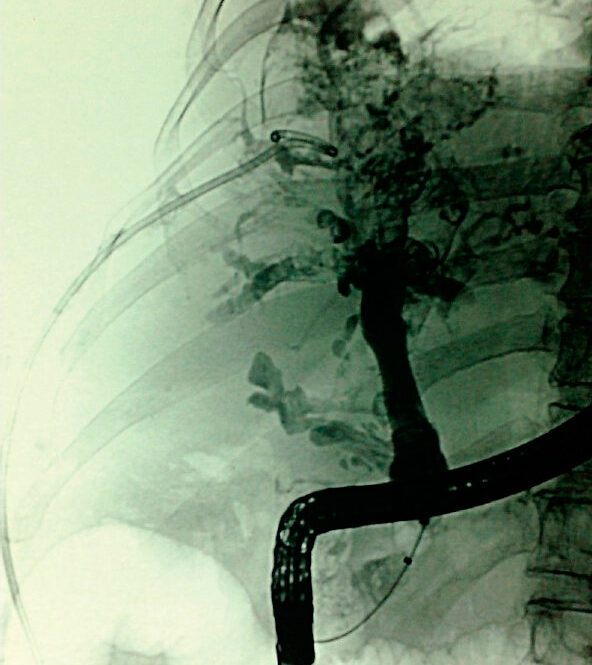 Εικόνα 1: Εικόνα αιμοχολίας σε ERCP μετά από παροχέτευση ηπατικού αποστήματος (βλ. καθετήρα).