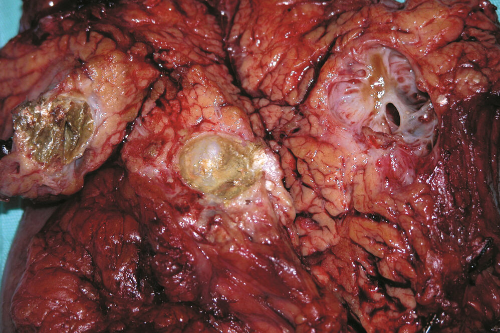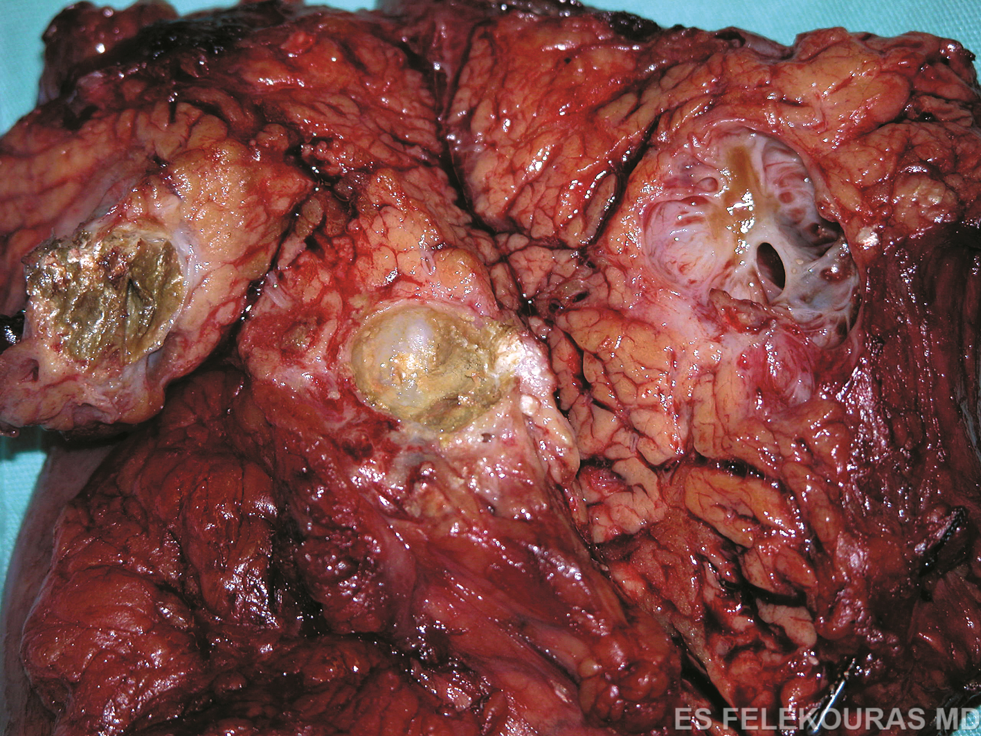 Τα βασικά παθολογοανατομικά ευρήματα της χρονίας παγκρεατίτιδας είναι η απώλεια αδενοκυψελιδικών κυττάρων (acinar cells), η συρρίκνωση των λοβίων, η ίνωση, οι ασβεστώσεις του παρεγχύματος και οι ποικίλες αλλοιώσεις των πόρων του παγκρέατος. Πιο συγκεκριμένα, στα αρχικά στάδια της νόσου το πάγκρεας παρουσιάζει κατά τόπους προσβολή. Μακροσκοπικά οι προσβεβλημένες περιοχές εμφανίζονται διογκωμένες και σκληρυντικές, ενώ η επιφάνεια διατομής χαρακτηρίζεται από την παρουσία αδρής λοβίωσης και ουλοποίησης. Σε ορισμένες περιπτώσεις μπορεί να συνυπάρχουν ψευδοκύστεις (Εικ. 1). Μικροσκοπικά, οι πάσχουσες περιοχές παρουσιάζουν περιλοβιακή ίνωση, ενώ τα περισσότερα αδενοκυψελιδικά κύτταρα έχουν αντικατασταθεί από συνδετικό ιστό. Κατά τόπους παρουσιάζονται αθροίσεις Τ-λεμφοκυττάρων και πλασματοκυττάρων, ενώ δεν αποκλείεται και η εμφάνιση κρυστάλλων ασβεστίου και στεατονεκρώσεων στο παρέγχυμα. Οι πόροι στα πάσχοντα τμήματα του αδένα εμφανίζουν κατά περιοχές ηωσινόφιλα πρωτεϊνικά βύσματα. Στα προχωρημένα στάδια, ολόκληρος ο αδένας έχει σκληρή υφή χωρίς λοβίωση. Ο κύριος παγκρεατικός πόρος και οι κλάδοι του εμφανίζουν διατάσεις και στενώσεις, στις δε περισσότερες περιπτώσεις περιέχουν πολλαπλούς λίθους διαφόρου μεγέθους (Εικ. 2).Στο 30-50% των περιπτώσεων υπάρχουν ψευδοκύστεις με παχύ τοίχωμα, οι οποίες στο ένα τρίτο επικοινωνούν με τους πόρους. Μικροσκοπικά, η ίνωση είναι εκτεταμένη περιλοβιακά και ενδολοβιακά, ενώ το επιθήλιο των πόρων μπορεί να είναι ατροφικό ή και να έχει εντελώς αντικατασταθεί από συνδετικό ιστό (Εικ. 3). Οι αρτηρίες παρουσιάζουν παχυσμένο τοίχωμα, ενώ τα νεύρα του αδένα συχνά σχηματίζουν ανομοιογενή δεμάτια με υπερτροφικά έλυτρα. Μεταξύ του φλεγμονώδους συνδετικού ιστού μπορεί να εμφανίζονται και νησίδες υγιούς παρεγχύματος με υπολείμματα αδενοκυψελιδικών κυττάρων και κάποια νησίδια του Langerhans (βλ. Εικ. 4). Έτσι σύμφωνα με τα ανωτέρω, οι σημαντικότερες αλλαγές της χρονίας παγκρεατίτιδας περιλαμβάνουν την ίνωση και την απώλεια των ενδοκρινών και εξωκρινών στοιχείων του αδένα.αίτητη για την ανάπτυξη του ΗΚΚ, ούτε όλοι οι κιρρωτικοί ασθενείς αναπτύσσουν ΗΚΚ. (εικόνα 1)